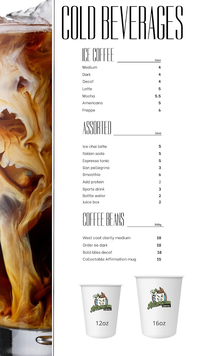 The coffee selection is equally impressive, highlighting beans like the West Coast Clarity Medium and Order 66 Dark, each priced at CA$18.00. Sweet beverage offerings, such as the rich Caramel Macchiato and soothing Chai Latte, cater to diverse palates. With glowing reviews from satisfied customers, Affirmation Coffee stands as a must-visit destination for coffee lovers and food enthusiasts alike, promising an experience that lingers long after your visit.
